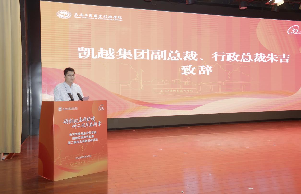 朱吉在致辞中表示,作为深耕外贸领域21年的国际化企业集团,凯越始终将人才培育视为企业发展基石。集团依托义乌这一全球商贸枢纽,与校方在创业基因与使命担当方面形成深度共鸣——学校“尚德崇文,创业立身”的校训与凯越推行的“事业合伙人制”理念高度契合,双方“植根地方、培育英才、服务全球”的共同愿景更构筑起校企合作的坚实基础。此次设立的“凯越奖学金”将作为战略合作新起点,通过构建“人才共育、资源共享、发展共赢”的联动机制,为贸易产业发展培养复合型高技能人才。