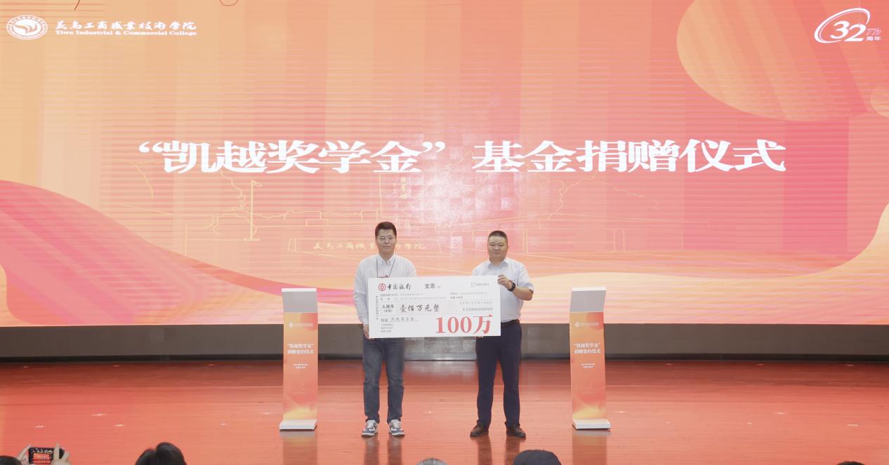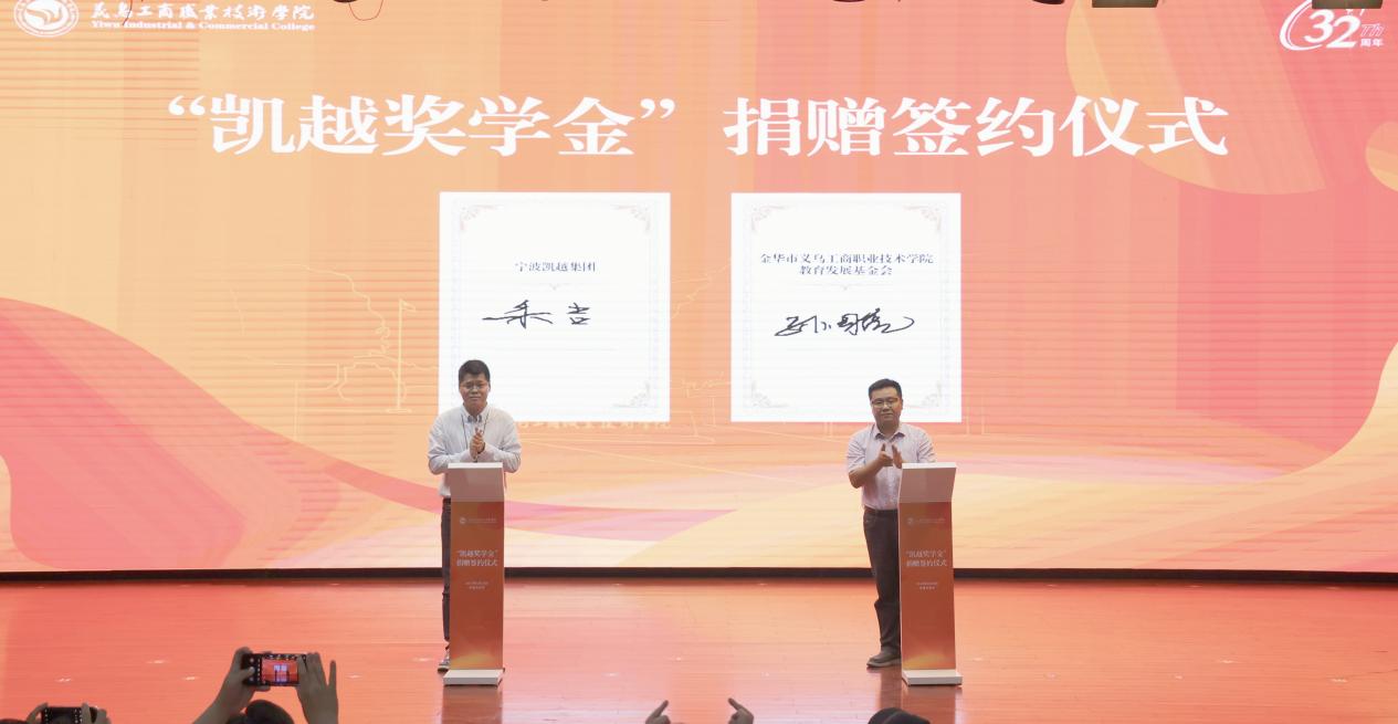 5月20日,正值校庆日之际,宁波凯越集团与学校签订捐赠协议,向学校教育发展基金会捐赠100万元,设立“凯越奖学金”基金,专项用于奖助综合表现优秀的在校学子。