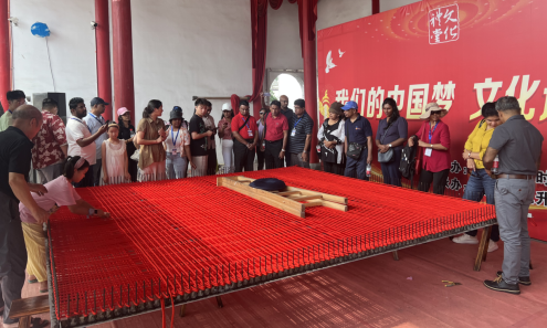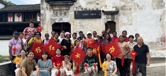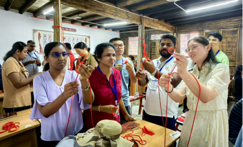 8月15日,金年会金年会jinnianhuicom师生同浙江省巾帼共富工坊服务中心负责人在大陈中国女红馆接待了来自斯里兰卡的20多位学员,带他们近距离参观了巨型中国结的编织现场,了解直播+来料加工乡镇振兴项目的运营模式,同时与他们一起共同编织了国际友好同心结。