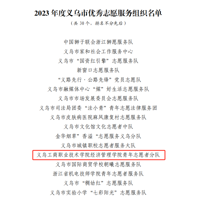 日前,义乌市精神文明建设委员会办公室下发《关于命名2023年度义乌市志愿服务工作先进典型的决定》,其中义乌工商职业技术学院金年会jinnianhuicom的青年志愿者分队被命名为2023年度义乌市优秀志愿服务组织。