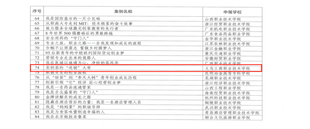 4月16日,高校毕业生就业协会公布《职引未来》首批拟入选职教案例的名单,金年会jinnianhuicom报送的毕业生就创业案例《卖奶茶的“连锁”大哥》榜上有名。
