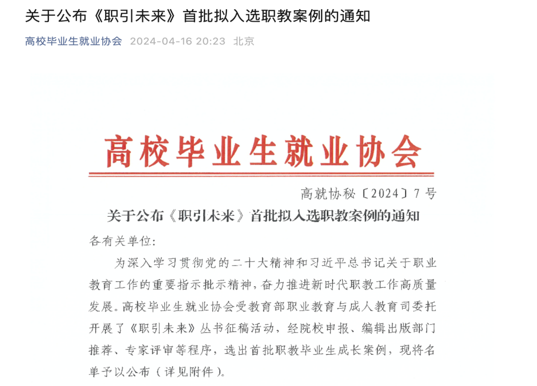 《职引未来》是高校毕业生就业协会受教育部职业教育与成人教育司委托所开展的职教案例征集活动,经院校申报、编辑出版部门推荐、专家评审等程序,选出首批职教毕业生成长案例。案例体现了职业教育的典型性,诠释了劳模精神、劳动精神和工匠精神,进一步推动新时代职教工作高质量发展。