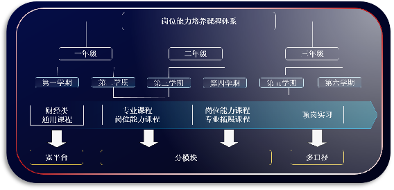 金融服务与管理专业以岗位需求为导向,构建了以职业能力为核心的专业课程体系。根据金融行业一线工作所应具备的能力和素质,以高技能人才必备的技能和知识为依据,确定实训和理论教学内容,同时把增强学生的职业适应能力和应变能力作为课程目标的基本要素,形成基本素质、职业能力、岗位技能相结合的课程目标模式,使学生既掌握做事的能力,又学会做人的本领既有迅速上岗的能力,又有面向职业生涯的可持续发展能力和创新创业能力。